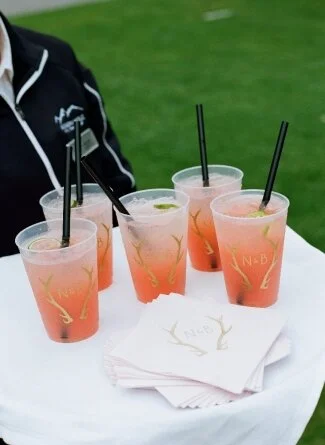 Natalie and Brad will always stand out as a wedding we loved and will never forget. They are a very sweet couple who loves the outdoors and adventures. Skiing is one of their favorite activities. When they first started dating they would book ski trips on Friday to the newest snow for the weekend and off they went. The ski town of Jackson Hole was the perfect fit for their summer wedding and Jackson Hole Golf & Tennis Club was the perfect venue. The cloudy day didn't stop this wedding from being beautiful and tons of fun! From the arch, to the garlands, to the antler wedding logo, no detail was overlooked. Natalie and Brad recently welcomed a baby boy into their adventures as well!