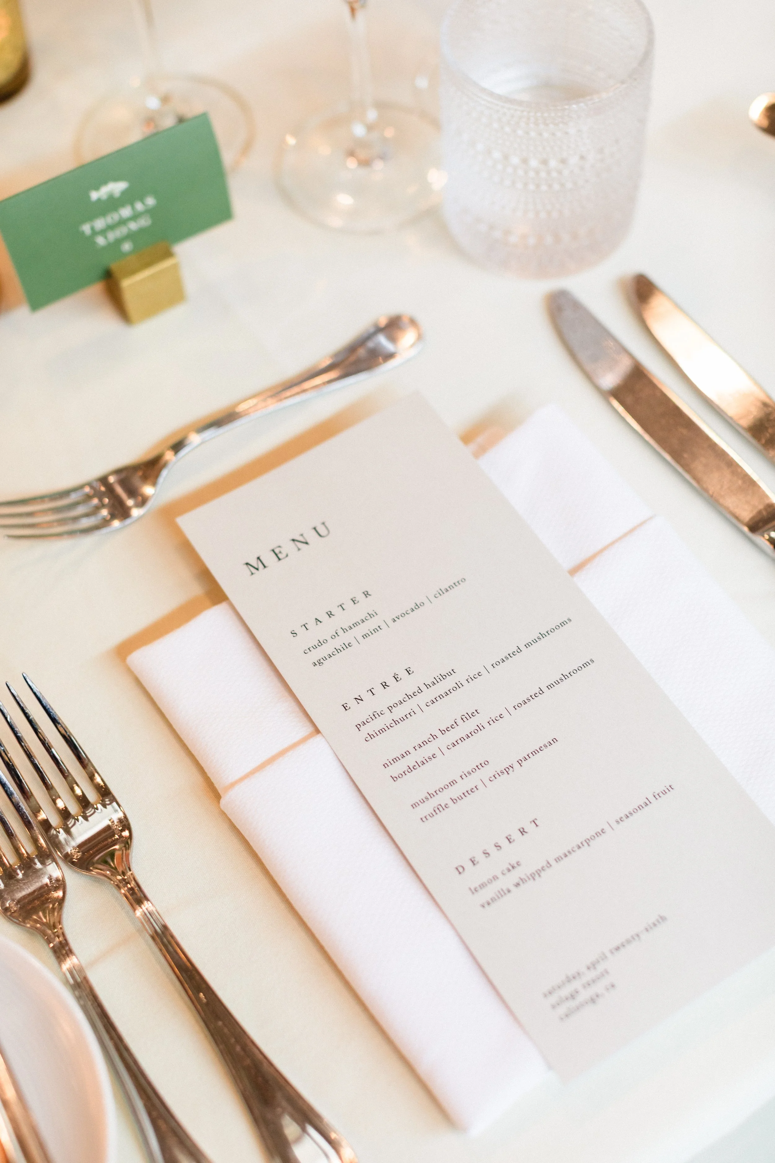 One of the biggest perks of hosting a Solage Napa wedding is how much the venue already includes. From ceremony chairs and reception tables to glassware, flatware, and place settings, Solage provides nearly everything you need for a beautifully executed wedding. This not only simplifies the planning process but also allows couples to be more intentional with their design investments. Of course, specialty rentals can always be layered in to personalize the space, but using most of what Solage offers in-house creates a strong foundation that keeps both logistics and budgets streamlined.