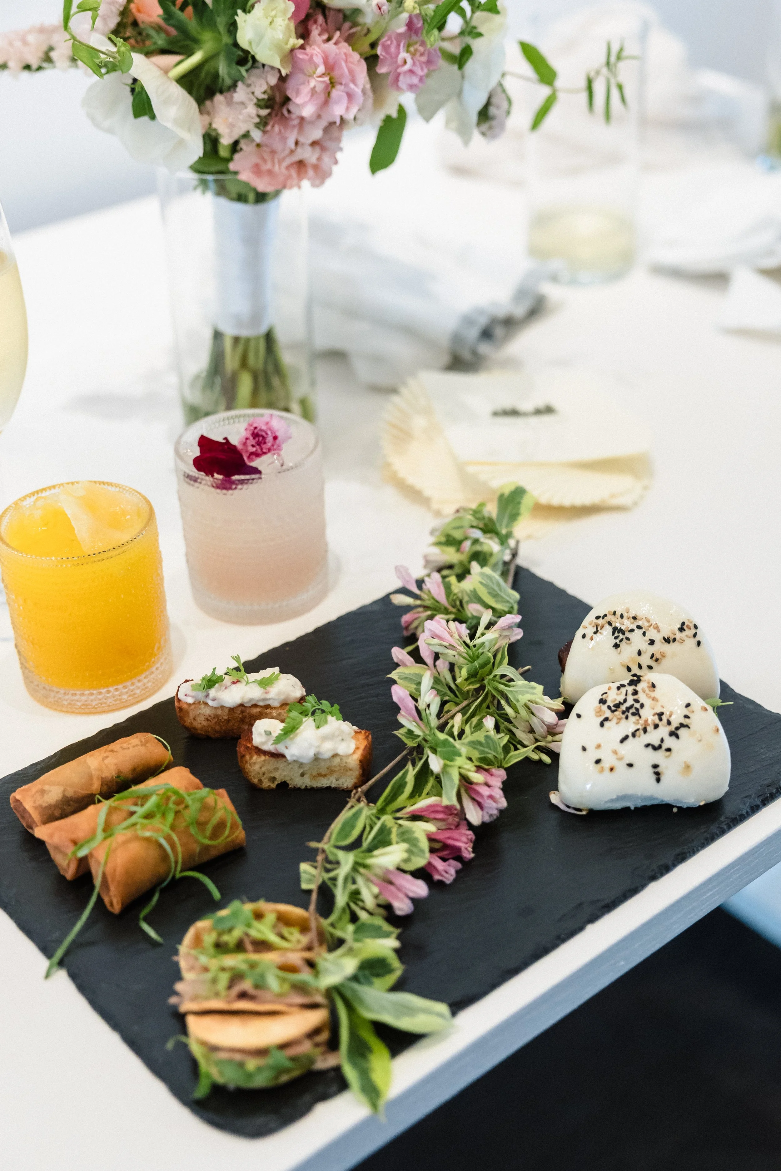 The design focused on the clean white aesthetic of Solage Resort with pops of blush, pink, and salmon added to make for a timeless affair. This wedding checks all the boxes with lush florals in a variety of textures, hand-painted watercolor table numbers, and custom signs (including a neon sign for the bar). Other details included late-night snacks, gold flatware, and a classic three-tier wedding cake.